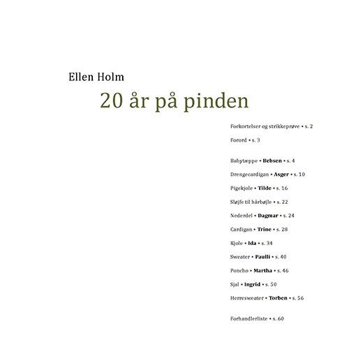 Ellen kalder det sin "Jubilærumsbog". Hun blev nemlig selvstændig strikdesigner for 20 år siden. For Ellen var det meget naturligt, at bogen skulle fotograferes på Skals Håndarbejdshøjskole, Ellen er nemlig uddannet fra Skals Håndarbejdsseminarium. Så det hele startede her. I bogen "20 år på pinden" har Ellen valgt at designe modeller til hele familien - men med hovedvægten på kvinder. Gennem årene har Ellen arbejdet med garn fra forskellige danske garnfirmaer. Derfor er modellerne i bogen også designet i forskelligt materiale. Gennemgående for modellerne er, at der er kræset for håndværket og det færdige resultat.Tusind tak til Skals Håndarbejdshøjskole for et fantastisk samarbejde.