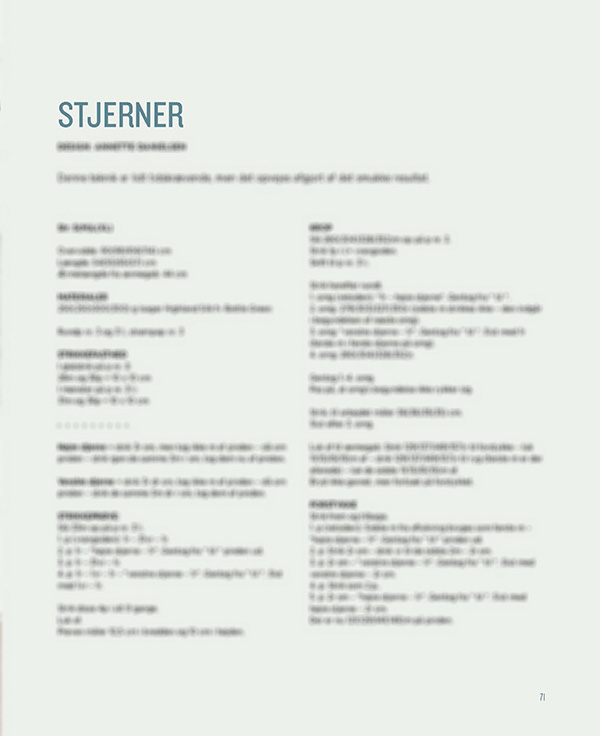 Designerne har smidt deres bedste designs, bunker af teknikker, fif og viden i en fælles pose, rystet den godt og kombineret det hele på den lækreste måde. Resultatet er blevet en delikat strikke-, hækle- og broderibog, fyldt med modeller både til den garvede og til begynderen.