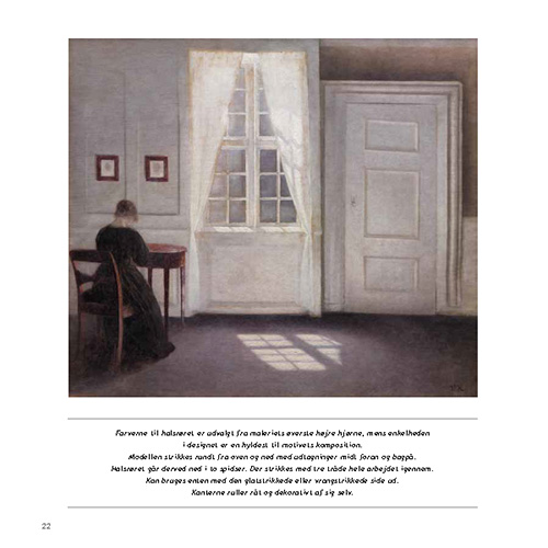 Hæftets modeller har fundet inspiration i Wilhelm Hammershøis malerier og i broderen, Svend Hammershøis, keramik. Resultatet er et strikkehæfte, som trækker klare linjer til det tidløse og enkle Hammershøiske univers. Ditte Larsen har gennem mere end 40 år været en markant del af den danske strikkeverden. Måske mest kendt som grundlægger af butikken Sommerfuglen på Vandkunsten. Men også som designer og arrangør af forskellige strikkeevents har Ditte Larsen gjort sig bemærket.