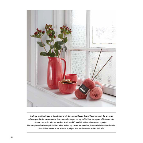 Hæftets modeller har fundet inspiration i Wilhelm Hammershøis malerier og i broderen, Svend Hammershøis, keramik. Resultatet er et strikkehæfte, som trækker klare linjer til det tidløse og enkle Hammershøiske univers. Ditte Larsen har gennem mere end 40 år været en markant del af den danske strikkeverden. Måske mest kendt som grundlægger af butikken Sommerfuglen på Vandkunsten. Men også som designer og arrangør af forskellige strikkeevents har Ditte Larsen gjort sig bemærket.