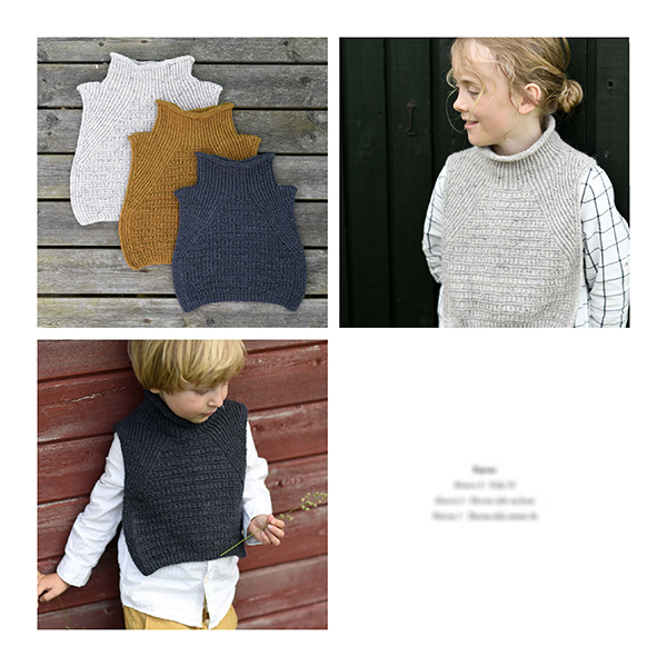 Anne har arbejdet i fire forskellige garner fra henholdsvis Filcolana, Isager garn, Rowan og Sandnes garn. Alle designs er vist i mindst to forskellige garner og farveversioner for at vise, hvordan udtrykket kan varieres.