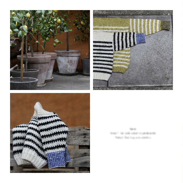 Her er arbejdet i tre forskellige garner fra henholdsvis Isager garn, Rowan og Sandnes. Alle modellerne bliver vist i minimum to forskellige garner og farve versioner, for at vise variationen i udtrykket.