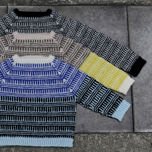 Her er arbejdet i tre forskellige garner fra henholdsvis Isager garn, Rowan og Sandnes. Alle modellerne bliver vist i minimum to forskellige garner og farve versioner, for at vise variationen i udtrykket.