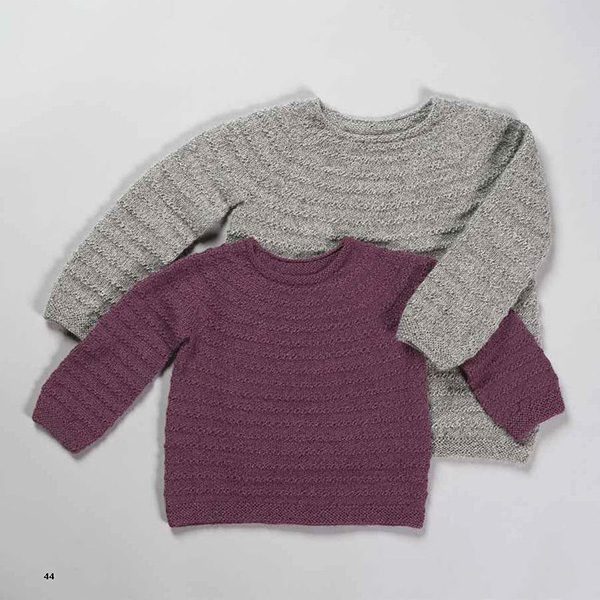 Der er skønne trøjer og sweatre, en kjole, en hue og en sej “arbejdsjakke”. Modellerne er vist i to farvekombinationer og de fleste kan strikkes til både drenge og piger.