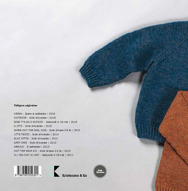 Der er skønne trøjer og sweatre, en kjole, en hue og en sej “arbejdsjakke”. Modellerne er vist i to farvekombinationer og de fleste kan strikkes til både drenge og piger.